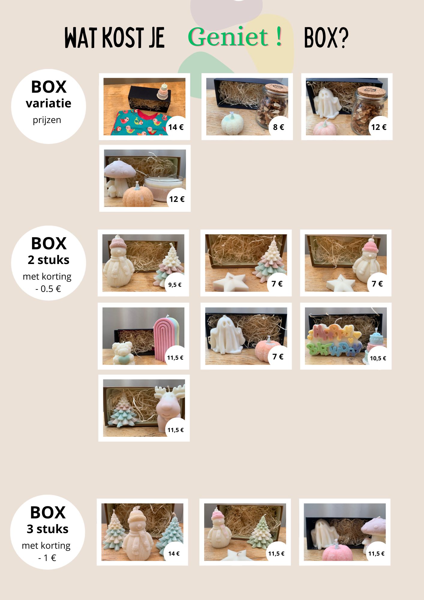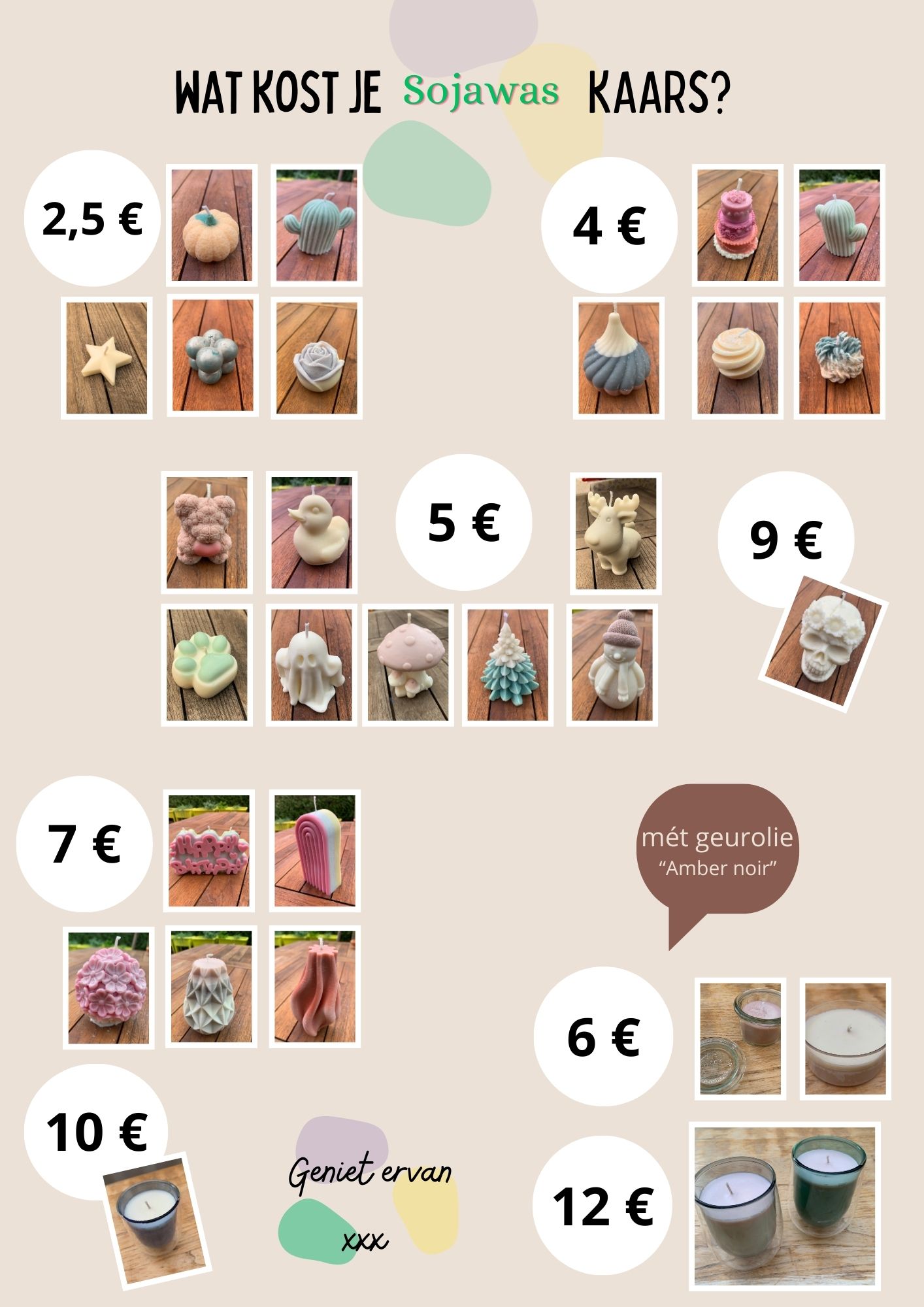 Wil je graag een bepaalde vorm, geur of kleur dan kunnen ze gemaakt worden op bestelling.